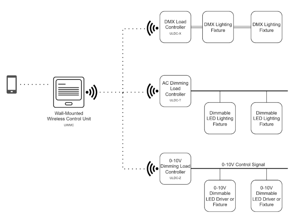 Connect LED Driver Controller (ULDC) hardware to one or more lighting fixtures, wirelessly connect to the ULDCs from the wall units to control the state and dimming level of your lighting fixtures.